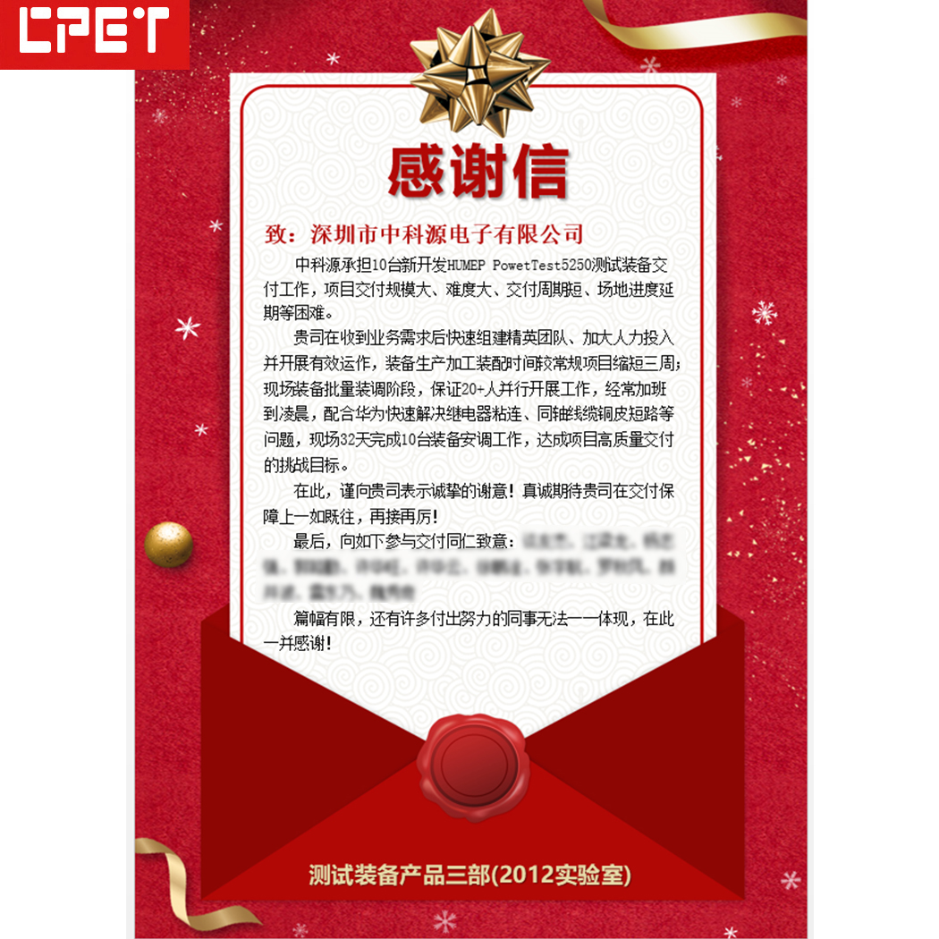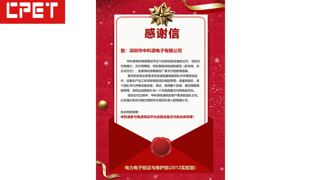 近日,华为技术有限公司测试装备产品三部(2012实验室)向深圳市中科源电子有限公司(CPET)发出感谢信,对中科源团队在HOMEIP PowerTest5250测试装备项目中的卓越表现表示高度认可。这已是中科源近年来第二次获得华为的正式致谢。2025-09-10